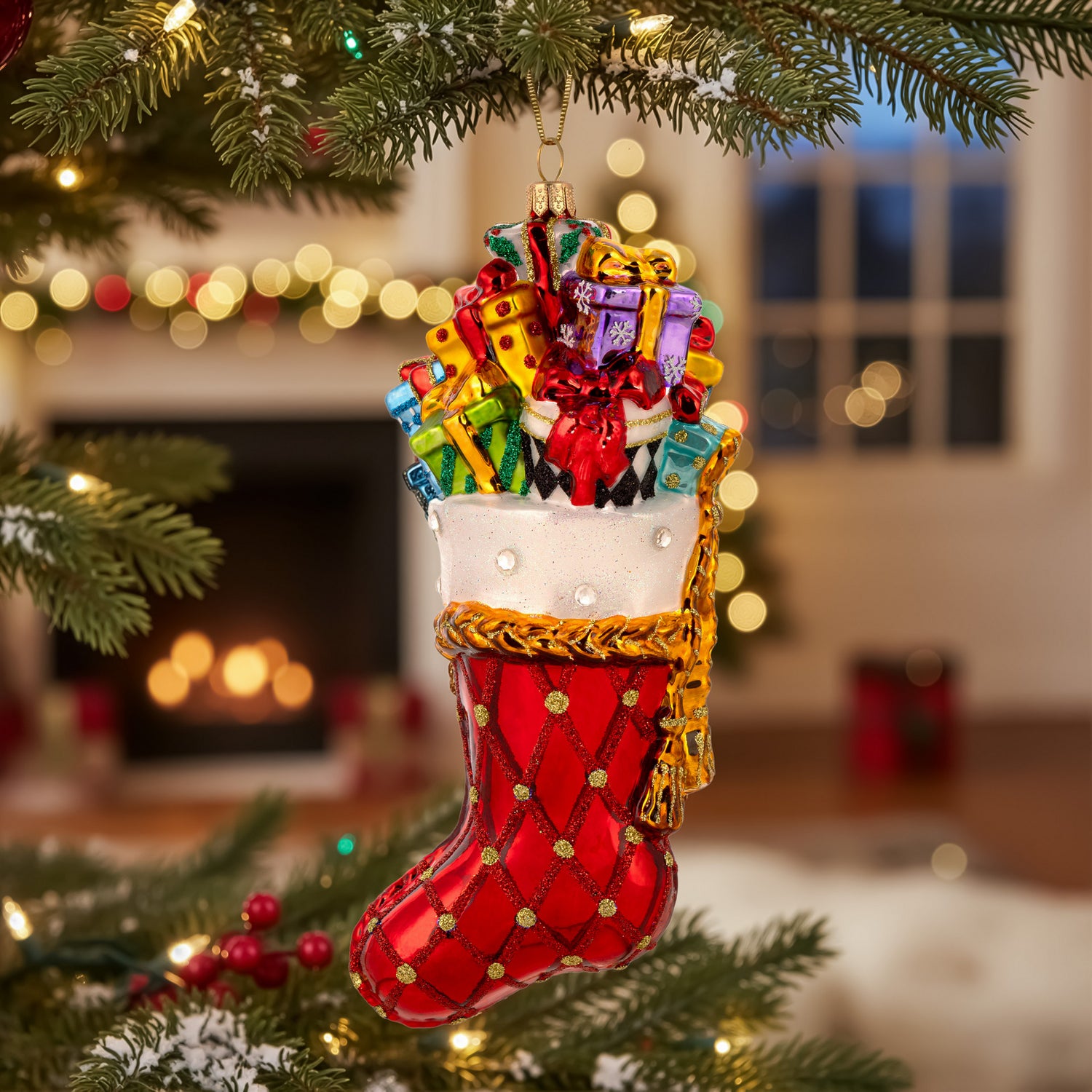 A festive stocking overflowing with presents, capturing the warmth and wonder of the season. One of the most loved Miss Christmas ornaments!