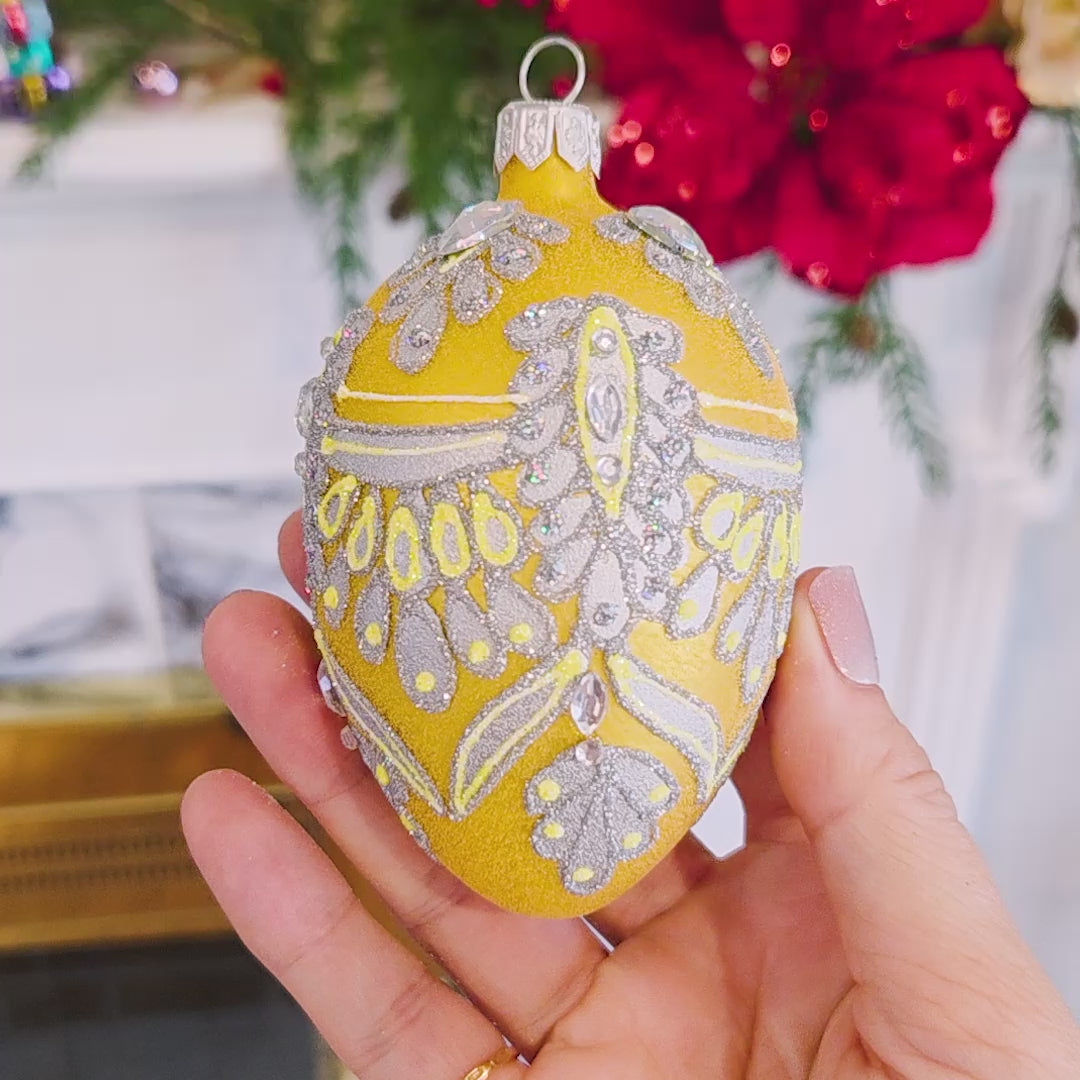 Introducing a new size! Miss Christmas Small Fabergé ornaments stand 3.9 inches tall, slightly more petite than our classic 5-inch Fabergés. Mix and match to create a perfect set, by combining the two sizes!