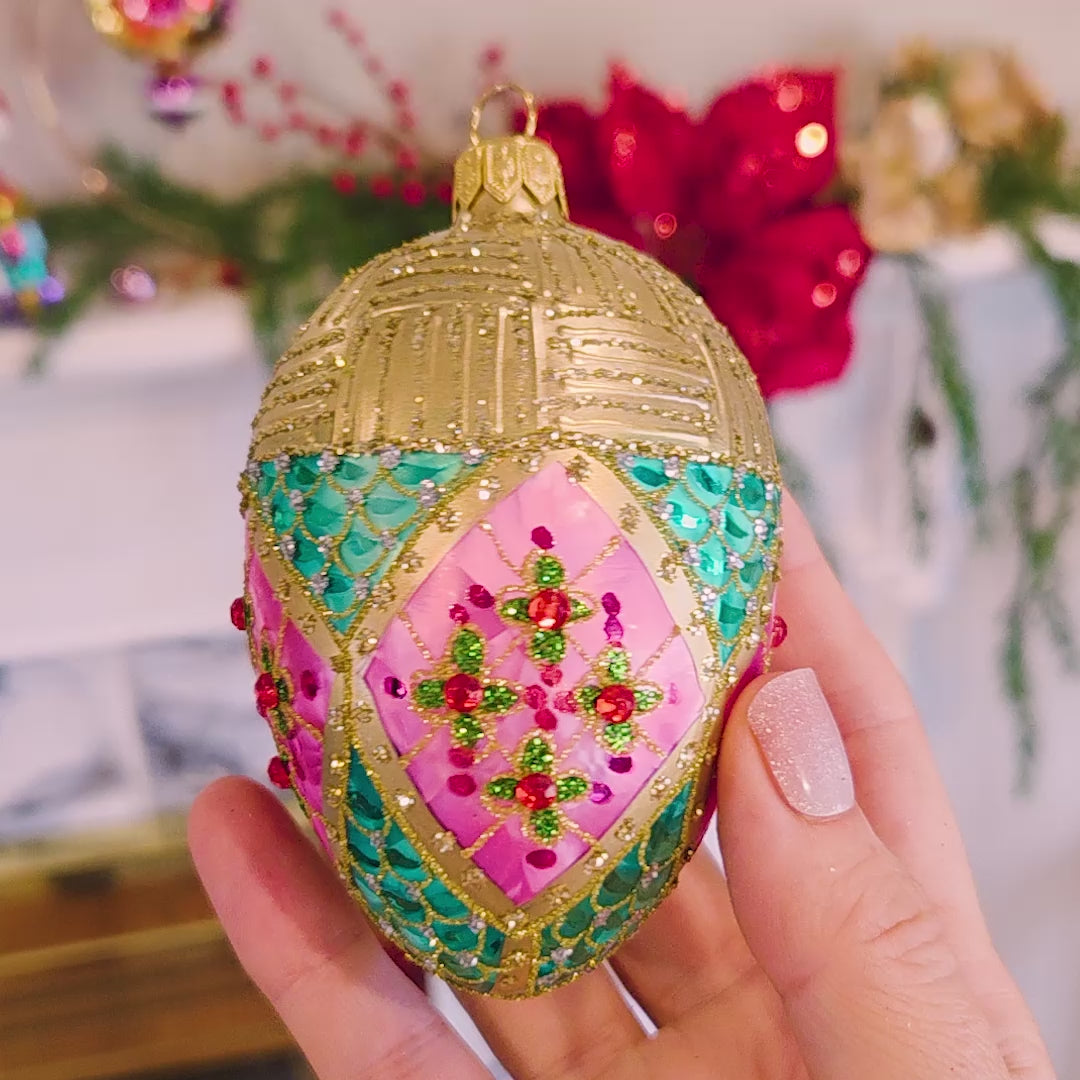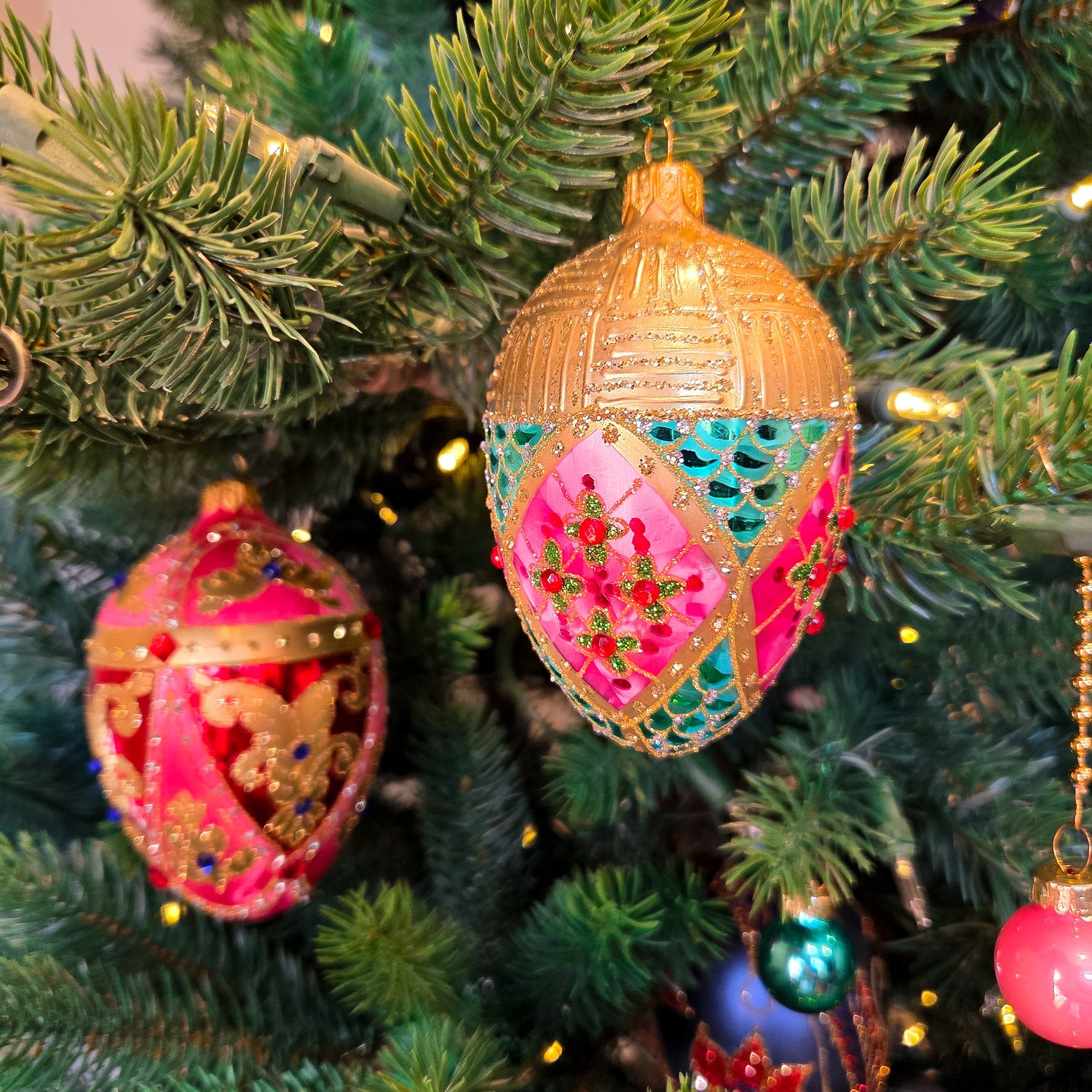 Introducing a new size! Miss Christmas Small Fabergé ornaments stand 3.9 inches tall, slightly more petite than our classic 5-inch Fabergés. Mix and match to create a perfect set, by combining the two sizes!