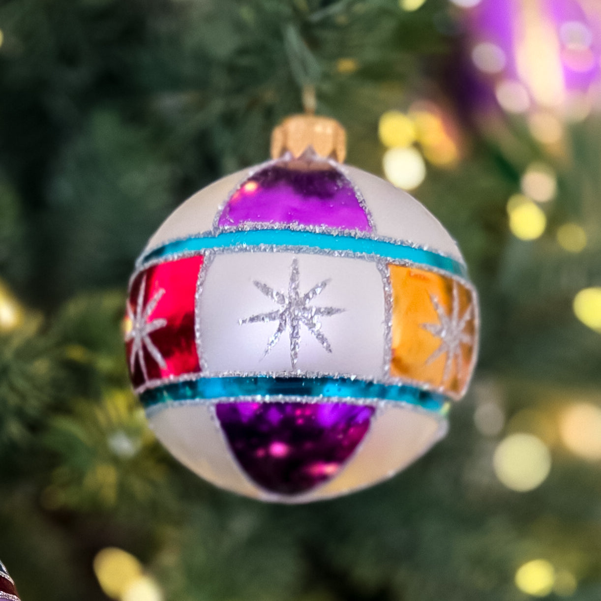 New design in 2025! A whirl of color and nostalgia, inspired by Christmases past. Each 3.1-inch bauble is painted by hand in a retro color scheme that really pops on a tree.