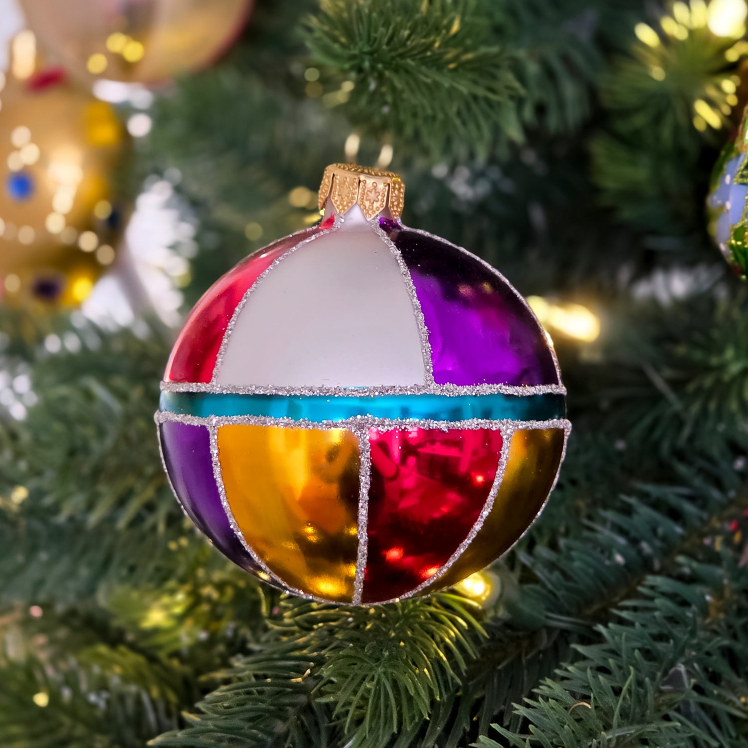 New design in 2025! A whirl of color and nostalgia, inspired by Christmases past. Each 3.1-inch bauble is painted by hand in a retro color scheme that really pops on a tree.